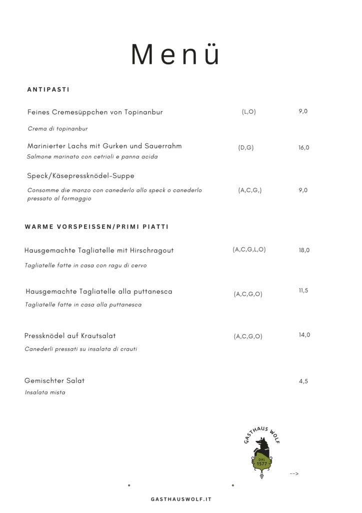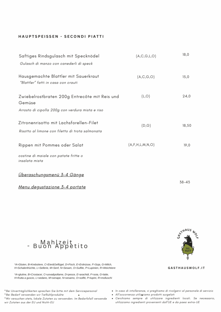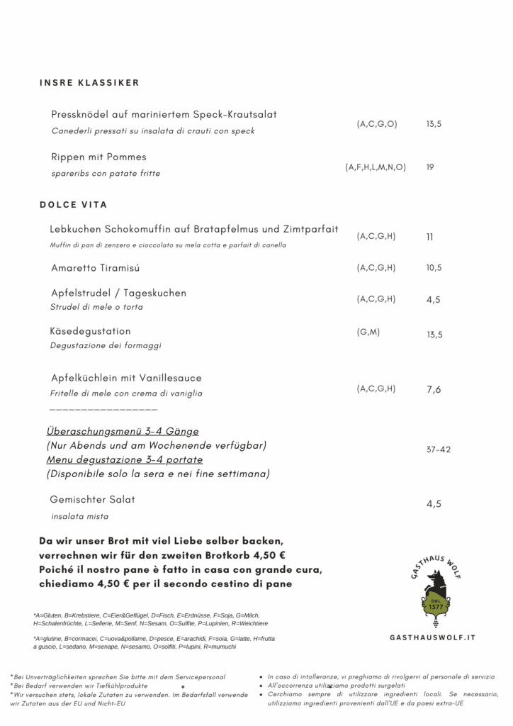 Saisonale Tagesgerichte zur Mittagspause. Kaffee und hausgemachter Kuchen am Nachmittag. Ein Augustiner Bier nach der Bergtour. Traditionelle Küche und ein guter Wein zum Abendessen. Koste dich durch die kleine, aber feine Speisekarte im Gasthaus Wolf am Brenner. Mahlzeit